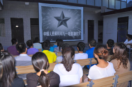 7月15日晚,廣通之家的小院內(nèi)座無虛席,黃陵縣店頭鎮(zhèn)文化站的同志正在為觀眾們播放紅色經(jīng)典電影《地雷戰(zhàn)》和《東進(jìn)序曲》,經(jīng)典的電影片段不時(shí)博得現(xiàn)場(chǎng)觀眾的熱烈掌聲和陣陣歡笑。